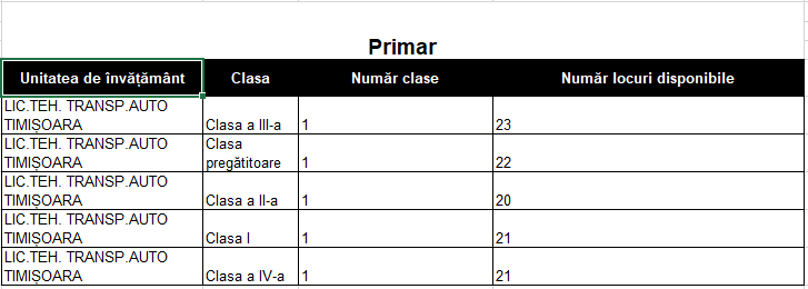 | LIC.TEH. TRANSP.AUTO TIMIȘOARA | Clasa pregătitoare | 1 | 22 |